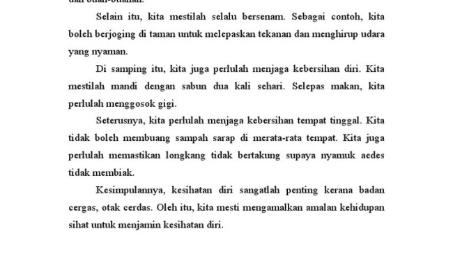 Panjang karangan anda hendaklah antara 200 hingga 250 patah perkataan. Dalam meniti arus kemodenan yang berteraskan sains dan teknologi maklumat, faktor kesihatan masyarakat pada hari ini berada pada tahap yang membimbangkan pihak berkuasa … Jul 09, 2021 · contoh karangan bahasa melayu (bm) tingkatan 1, 2, 3.